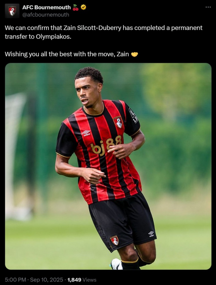 即时比分-官方:伯恩茅斯20岁边锋杜伯里永久转会至奥林匹亚科斯